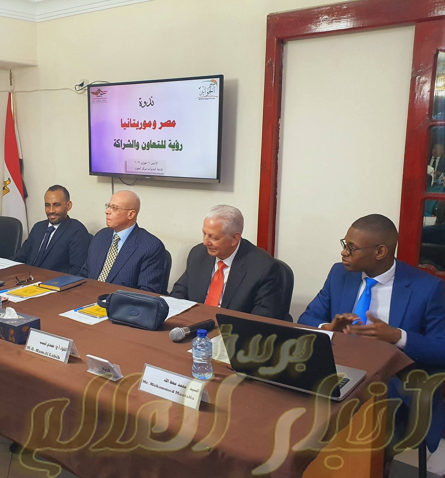 كتبت:نور محمد البيومى بدعوة من اللواء حمدى لبيب رئيس مركز الحوار للدراسات السياسية والاعلامية للمهندس مدحت بريك مجاور رئيس لجنة الصناعة بالمنظمة المصرية للسلام والأمن الاجتماعي والتنمية للمشاركة بفاعليات ندوة 《مصر وموريتانيا … رؤية للتعاون والشراكة》بداءة بكلمة افتتاحية من اللواء أ.ح/ حمدي لبيب – رئيس مؤسسة الحوار للدراسات والبحوث الإنسانية وقدم الباحثان الموريتانيان ورقتي عمل؛ الاولي قدمها الباحث/ محمد معط الله _ باحث ماجستير في جامعة القاهرة بعنوان “الآفاق المستقبلية للعلاقات المصرية الموريتانية”، والثانية قدمها الباحث/ ابي حمادي المصيف بعنوان ” الاقتصاد الجديد : مصر وموريتانيا .. رؤية للتكامل…