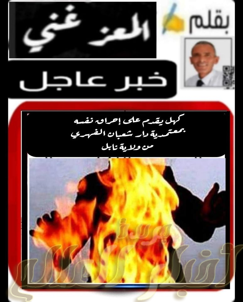 أقدم كهل صباح اليوم الأحد 4 جويلية 2021 على حرق نفسه بمنطقة الغويبة بدار شعبان الفهري من ولاية نابل