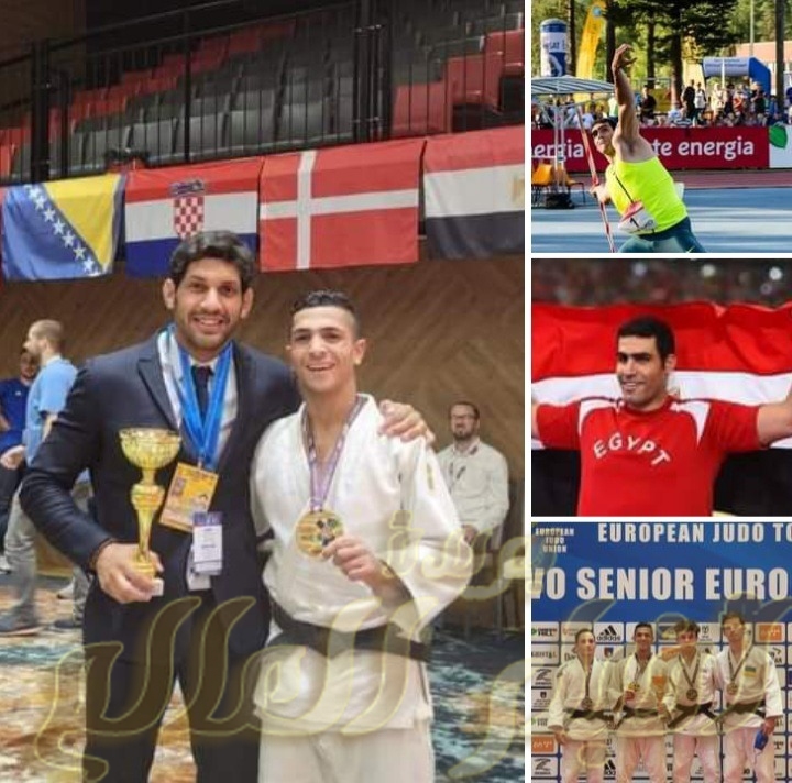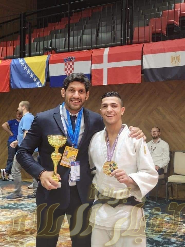 والبطل يسرى سامى لاعب منتخب مصر فى الجودو وابن قرية الزنكلون لحصوله على الميدالية الذهبية فى وزن ٦٠ كجم ببطولة كأس أوروبا للجودو المقامة فى البوسنة .