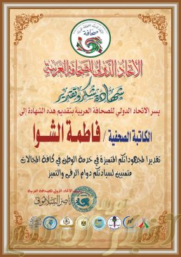 حيث قام رئيس الاتحاد الدولى للصحافة العربية الدكتور ناصر السلمونى بتقدم وسام وشهادة تقدير للدكتورة فاطمة الشواء .