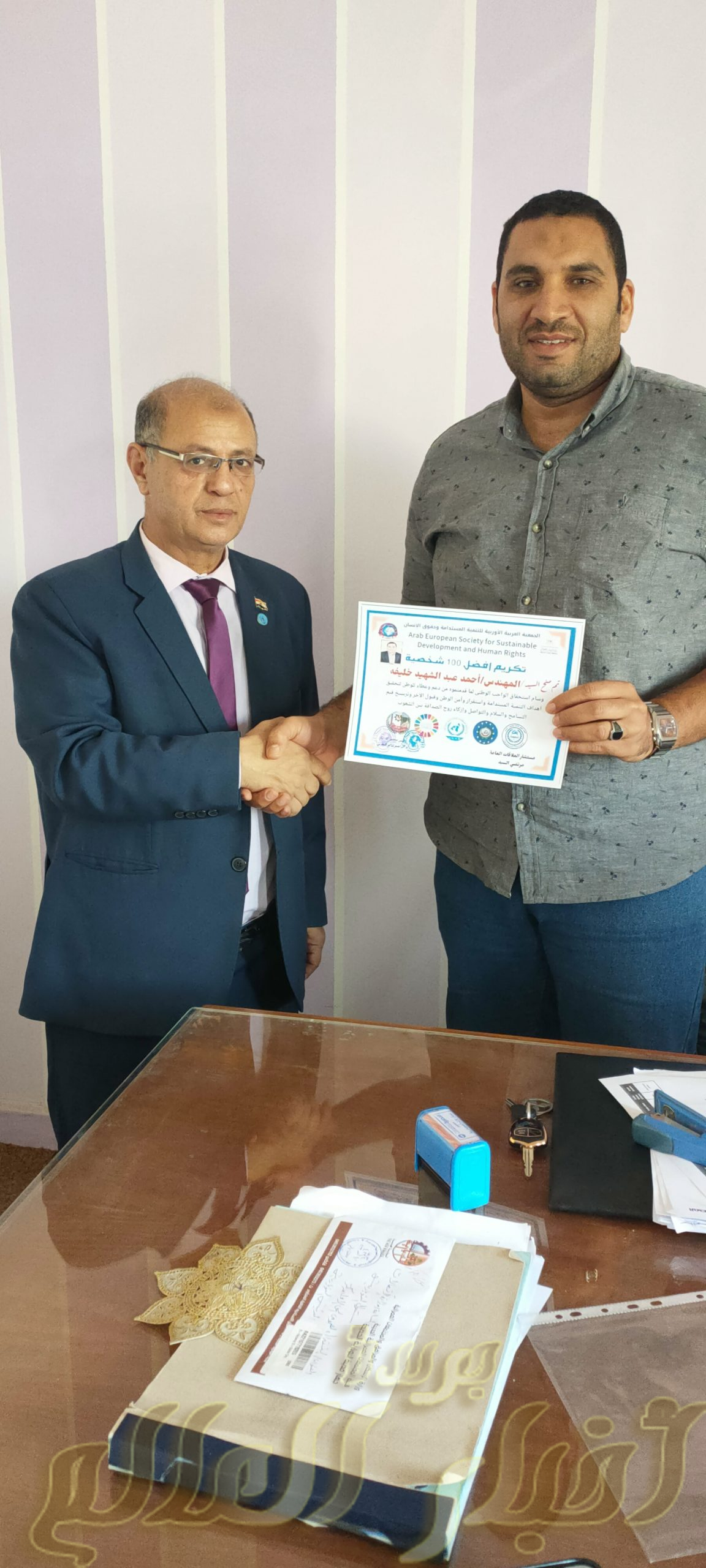 قام وفد من الجمعية العربية الأوربية للتنمية المستدامة وحقوق الإنسان بتكريم قيادة الشركة المصرية للاتصالات بالنوبارية مكون من رئيس الجمعية الدكتور ابراهيم سالم المغربى ومستشار العلاقات العامة التستاذ مرتضى السيد بتكريم المهندس احمد عبد الشهيد من قيادة الشركة المصرية للاتصالات بالنوبارية وذلك لنشاطة الغير مسبوق وعمله الداؤب فى خدمة الوطن والمواطن