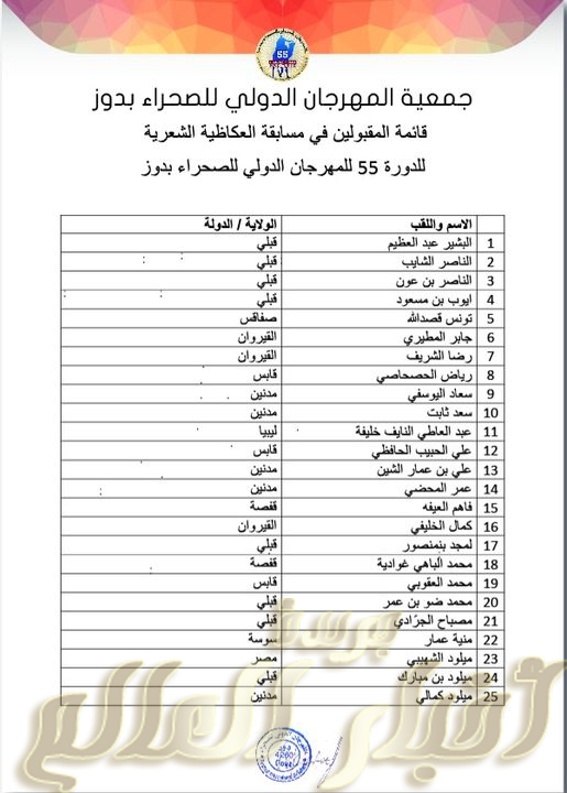قائمة الشعراء المقبولين في مسابقة العكاظية الشعرية في الدورة 55 للمهرجان الدولي للصحراء بدوز.