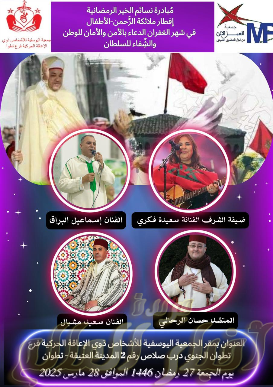الغفران رمضان المبارك وبشراكة مع جمعية اليوسفية للأشخاص ذوي الإعاقة الحركية فرع تطوان وبدعم من رعايا جلالة الملك محمد السادس حفظه الله،تم يوم الجمعة 27 رمضان 1446 الموافق 28 مارس 2025 بمقر جمعية اليوسفية للأشخاص ذوي الإعاقة الحركية فرع تطوان بالمدينة العتيقة لتطوان ،إفطار ملائكة الرحمن الأطفال في شهر الغفران…الدعاء بالأمن والأمان للوطن والشفاء للسلطان،كانت ليلة ربانية صوفية بامتياز أحيتها أصوات تُلامس القُلوب وتغوص في وجدان الإنسان.