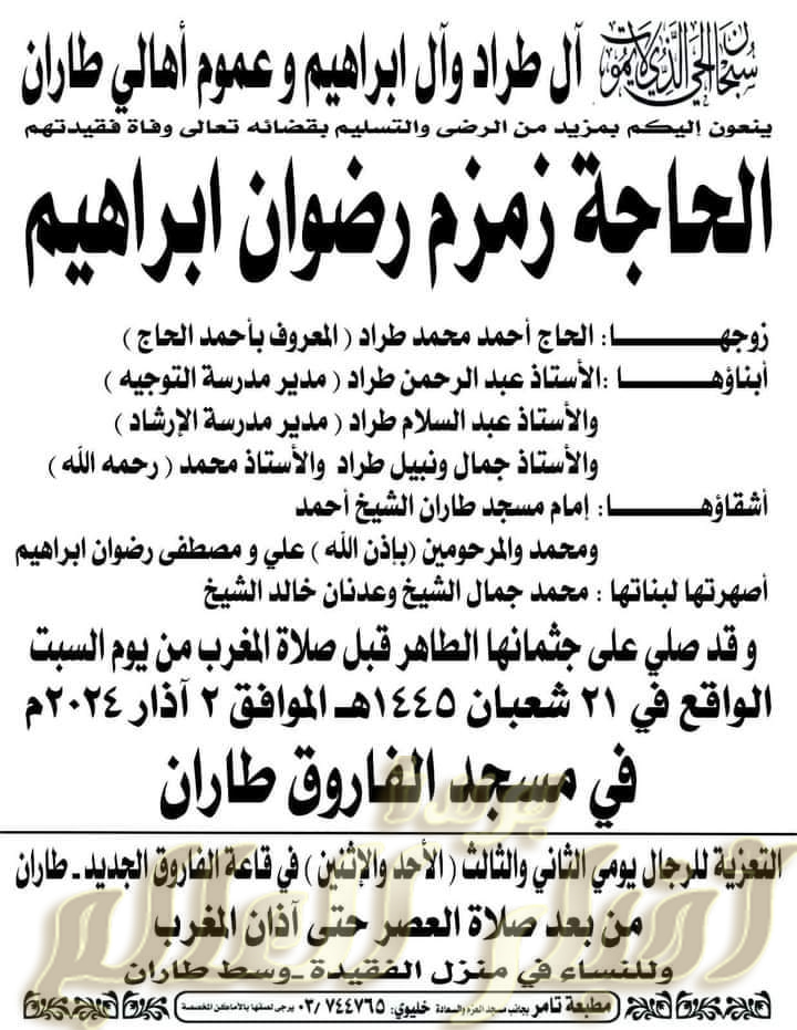 نتقدم بأحر التعازي والمواساة إلى الأخ والصديق الغالي د.عبد الرحمن طراد وجميع أفراد عائلته الكريمة سائلين المولى عز وجل أن يلهمكم الصبر والسلوان