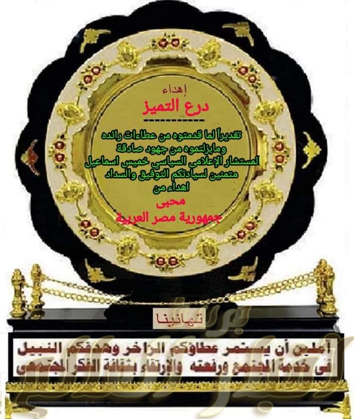 يتقدم رئيس مجلس الادارة المستشار الاعلامى والسياسى خميس اسماعيل بتكريم وتقدير اعضاء الحملة  متمنيا من الجميع الاستمرار فى العمل الجاد لرفعة الوطن وخدمة بلدنا الحبيبة مصر تحيا مصر تحيا مصر
