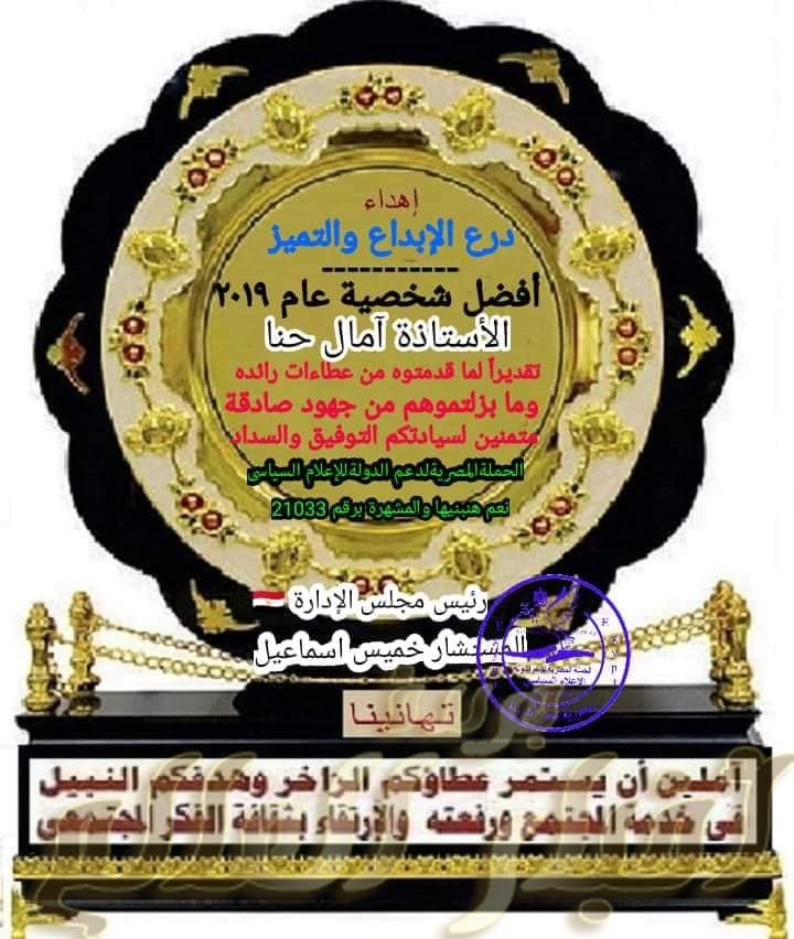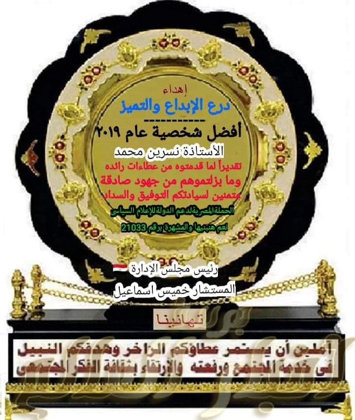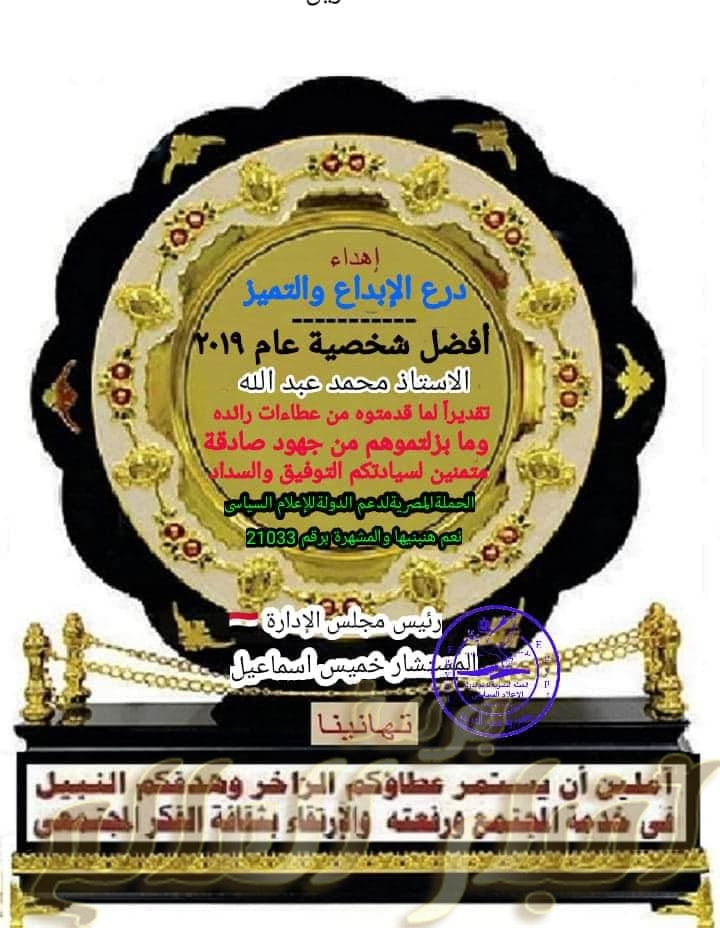 تكريم افضل شخصيات عام 2019 بالحملة المصرية لدعم الدولة الاعلام السياسى تحت شعار نعم هنبنيها المشهرة برقم 21033 لسنة 20019