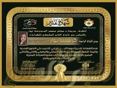 قامت مجلس إدارة جريدة وموقع وقناة مصر المحروسة ونادي التاج الملكي للهوايات بتكريم الفنانة المتألقة والموهبة كريستينا نوار أصغر سفيرة للسياحة المصرية ولجهودها في تمثيل مصر وإبداعها المتميز والراقي في الفنون الهندية والإبداع والغناء والتمثيل مع تمنياتنا لها بدوام التفوق والنجاح الدائم ان شاء الله