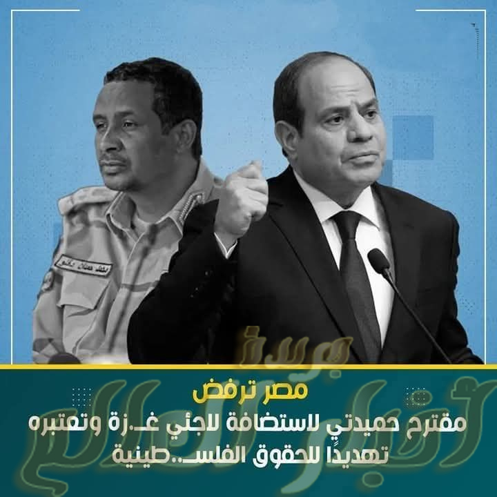 سادت حالة من القلق والانزعاج الشديدين في الأوساط الوطنية المصرية، عقب تداول تقارير إعلامية حول مقترح تقدم به محمد حمدان دقلو، المعروف بـ”حميدتي”، قائد قوات الدعم السريع في السودان، يقضي باستضافة أعداد كبيرة من النازحين الفلسطينيين من قطاع غزة داخل مناطق سيطرته.