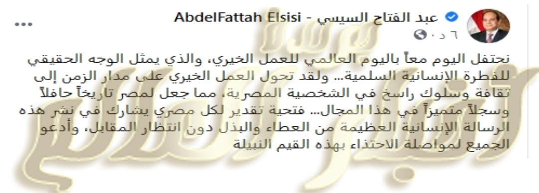 وكتب الرئيس، عبر حسابه الرسمى على موقع “فيسبوك”، اليوم الأحد: “نحتفل اليوم معًا باليوم العالمى للعمل الخيرى، والذى يمثل الوجه الحقيقى للفطرة الإنسانية السلمية، ولقد تحول العمل الخيرى على مدار الزمن إلى ثقافة وسلوك راسخ فى الشخصية المصرية، مما جعل لمصر تاريخًا حافلاً وسجلاً متميزًا فى هذا المجال”.