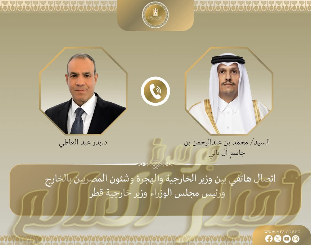 تلقى د. بدر عبد العاطى وزير الخارجية والهجرة يوم الجمعة ١٧ يناير ٢٠٢٥ إتصالًا هاتفيًا من الشيخ محمد بن عبدالرحمن بن جاسم آل ثاني رئيس مجلس الوزراء وزير خارجية دولة قطر الشقيقة، حيث تناول الاتصال تطورات الأوضاع في غزة والمستجدات بالمشهد السوري.