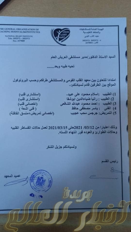 ومن جهة أخرى .. وصل الى المستشفى بالأمس فريق طبي من المعهد القومى للقلب للكشف وإجراء القساطر القلبية مجانا .