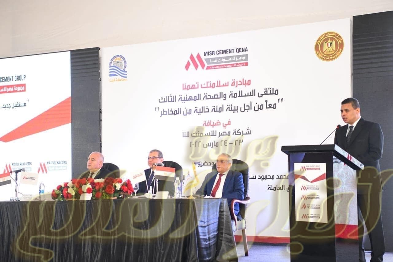 قنا/ ممدوح السنبسى شارك السيد محمد سعفان وزير القوى العاملة واللواء أشرف الداودى محافظ قنا في ختام ملتقي السلامة والصحة المهنية الذى تم تنظيمه بمقر شركة مصر للأسمنت ( قنا ) تحت شعار ” معا من أجل بيئة آمنة خالية من المخاطر ” ، وذلك بحضور اللواء السيد عبد الفتاح حرحور رئيس مجلس إدارة مجموعة مصر للأسمنت ، والمهندس طارق طلعت العضو المنتدب للشركة ، و حسام طلبه مدير عام القوى العاملة بقنا ، و سيد حامد رئيس الإتحاد المحلى لعمال قنا والأقصر ، وعدد من مديرى القطاعات بالشركة ،…