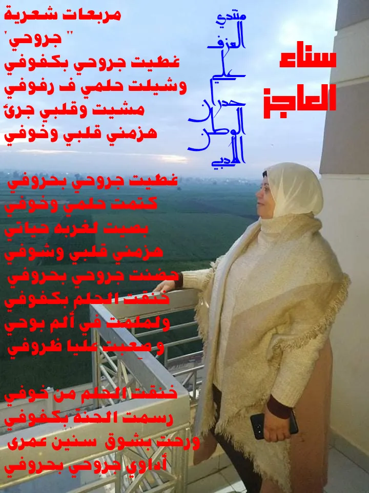 مربعات شعرية ” جروحي’ غطيت جروحي بكفوفي وشيلت حلمي ف رفوفي مشيت وقلبي جرئ هزمني قلبي وخوفي غطيت جروحي بحروفي كتمت حلمي وخوفي بصيت لغربه حياتي هزمني قلبي وشوفي حضنت جروحي بحروفي خنقت الحلم بكفوفي ولملمت في ألم بوحي و صِعبت عليا ظروفي خنقت الحلم من خوفي رسمت الحنة بكفوفي ورحت بشوق سنين عمرى أداوي جروحي بحروفي ✍️ سناء العاجز