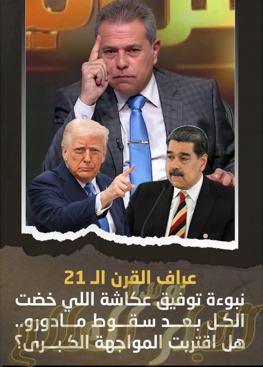 فنزويلا.. خطة أمريكا قبل الحرب الكبرى في الشرق الأوسط بقلم: المستشار الإعلامي والسياسي خميس إسماعيل زمان كنا بنضحك على كلام توفيق عكاشة… نحسبه هراء وتخاريف، وهو أول واحد قال إن أمريكا هتحط إيديها على فنزويلا قبل أي مواجهة كبرى في المنطقة العربية لتعويض أي نقص للبترول. وقتها كنا بنسأل: “فنزويلا اللي في آخر الدنيا إيه دخلها بينا؟”… لكن اليوم، مع كل التفاصيل اللي بتحصل، نرجع نطبطب على راسنا ونقول: “يا ريته ما قلناش إن الراجل كان صح”. ساعتها عكاشة قعد على كرسيه، يشرب الشاي، ويرمي الصدمة: “أمريكا هتحط إيدها على…