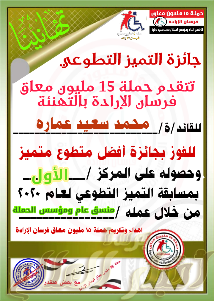 حملة 15 مليون معاق فرسان الإرادة تطلق ” جائزة التميز التطوعي ” على المستوى المحلى تحيا مصر تنطلق اليوم الأحد ٢٠٢١/١/٢ . حملة 15 مليون معاق فرسان الإرادة جائزة التميز التطوعي صرح اليوم الاستاذ \ محمد سعيد عماره المنسق العام ومؤسس الحملة انه سوف تطلق اليوم جائزة التميز التطوعى فى نسختها الاولى في المجالات التالية العمل الجماعي والعمل العام والعمل الخاص والمشروعات التنموية و البرلمان و المحليات يشارك فى الجائزة كافة الفئات من الشباب و المرأة و وذوى الاعاقة و العمال والفلاحين والشباب واعضاء الحملة و تنقسم الجائزة الى خمسة…