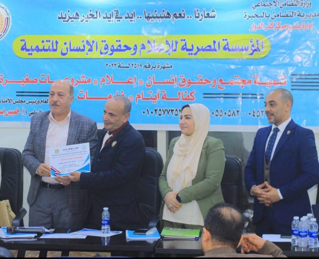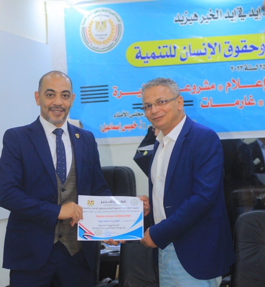 كتبت:أمير عمار انطلاق المؤتمر الأول للمؤسسة المصرية للاعلام وحقوق الإنسان والتنمية تحت عنوان إنجازات سيدات مصر برئاسة المستشار خميس اسماعيل رئيس الحملة المصرية لدعم الإعلام السياسى للدولة المصرية تم تكريم المهندس مدحت بريك مجاور رئيس لجنة الصناعة بالمنظمة المصرية للسلام والأمن الاجتماعي والتنمية وسط حضور كبير من رجال الدولة والإعلاميين تقديرا لجهوده في دعم الدولة الوطنية