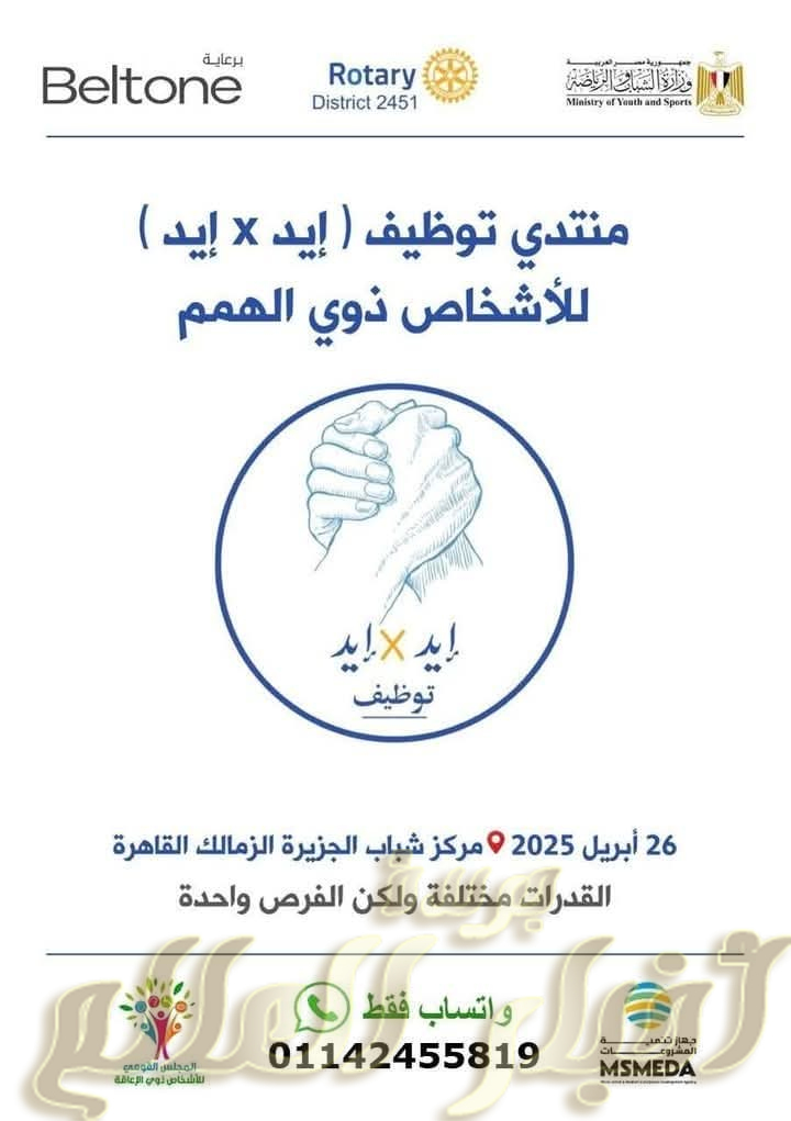 متابعه مكتب أسيوط سحر محمد عبدالرحمن تحت رعاية الدكتورة إيمان كريم المشرف العام على المجلس القومي للأشخاص ذوي الإعاقة، ينظم المجلس بالتعاون مع روتاري مصر ممثلة في لجنة ذوي الإعاقة، ووزارة الشباب والرياضة وجهاز تنمية المشروعات السبت المقبل، ملتقى توظيف “إيد في إيد” للأشخاص ذوي الإعاقة، ويأتي الملتقى برعاية شركة بلتون، بمركز شباب الجزيرة، من الساعة 11 صباحًا حتى الـ 9 مساءًا.وسيُقام على هامش الملتقى معرض لمنتجات الأشخاص ذوي الإعاقة، بالإضافة إلى ورش تدريبية توعوية للمشاركين في الملتقى حول قضايا الإعاقة، إلى جانب ورش تدريب على أساسيات لغة…
